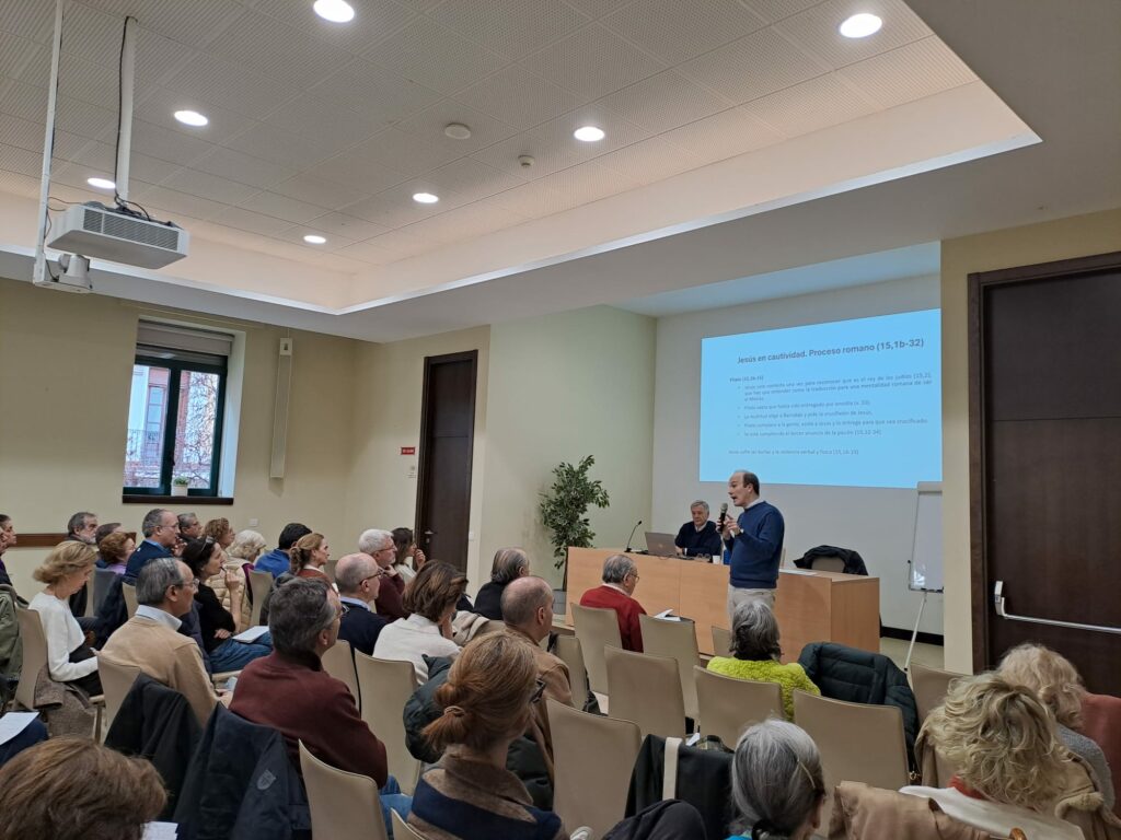 Pablo Alonso fue deteniéndose en lo que ocurre cada día de esa semana, que empieza con la entrada de Jesús en Jerusalén y termina con la vista de las mujeres a la tumba y el anuncio de la Resurrección. Nos hizo caer en la cuenta de que el relato de la Pasión puede dividirse en dos partes (Jesús en libertad y Jesús en cautividad) que tienen estructuras paralelas.